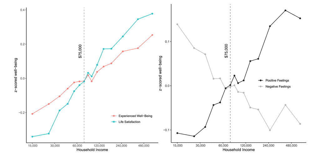 The paper states: “Higher incomes may still have potential to improve people’s day-to-day wellbeing, rather than having already reached a plateau for many people in wealthy countries. […] There is no evidence of an income threshold at which experienced and evaluative wellbeing diverged, suggesting that higher incomes are associated with both feeling better day-to-day and being more satisfied with life overall.”